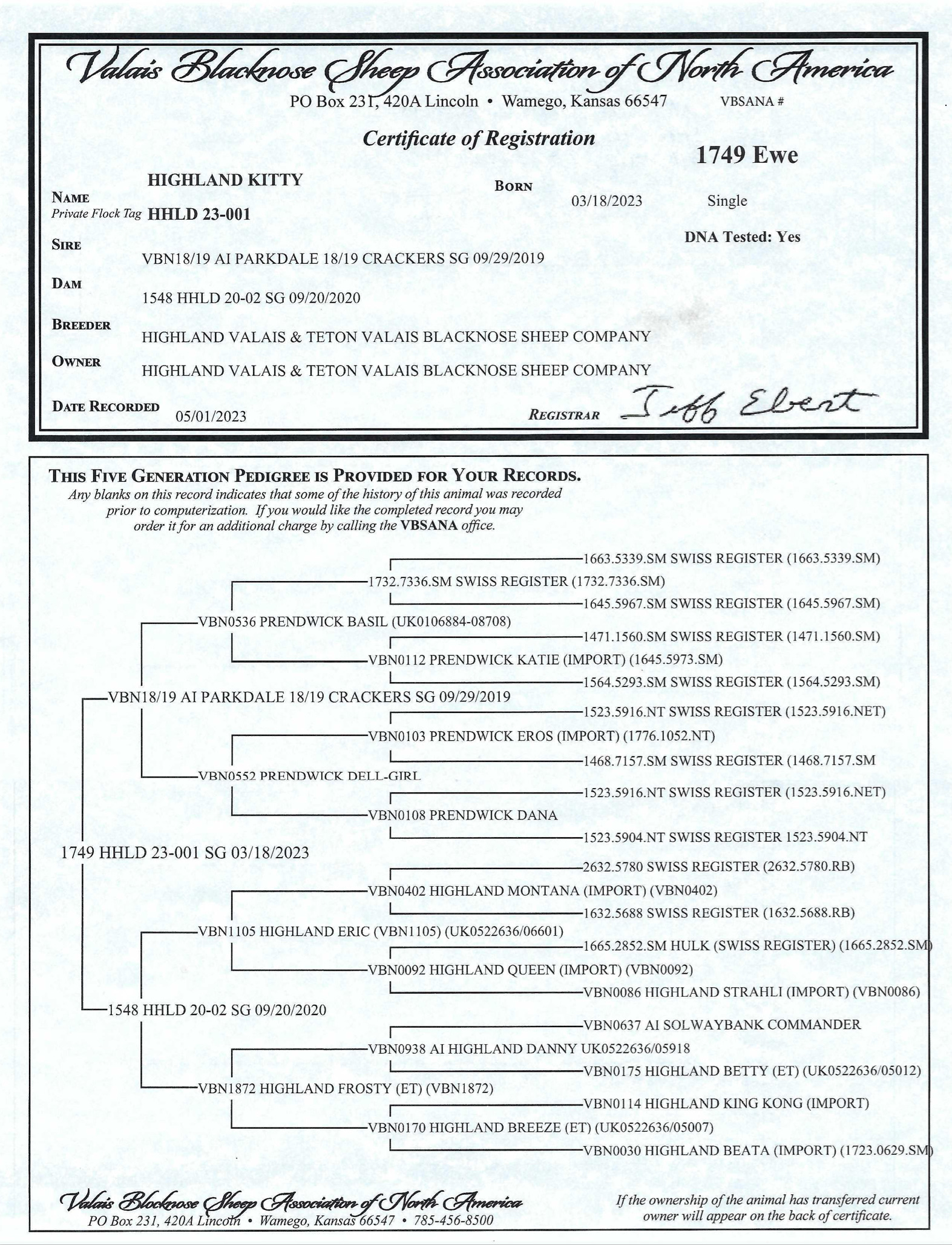 - Progeny – Sire of VTVBS Magic, the Grand Champion Spitti at the 2025 USA National Valais Blacknose Show and Grading. Bred & owned by Jill Markowski, Vermont Valais Blacknose Sheep Company.